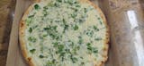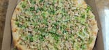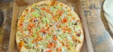 Topped with eggplant, tomato, peas & fresh mozzarella in light red sauce.