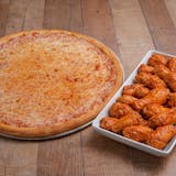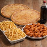 2 large cheese pizzas, 2 large French fries, 20 wings & 2 liter soda.