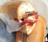 Capicola ham, provolone cheese, pepperoni, salami, croutons, roasted green peppers, hot cherry peppers, black olives, onions, tomato, cucumber, mushrooms atop iceberg lettuce.