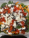 Pesto sauce, mozzarella, fresh spinach, sun dried tomatoes, roasted peppers, feta cheese & olives.