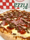 Pepperoni, italian sausage, bacon, ham, beef, signature pizza sauce, mozzarella and provolone.