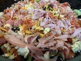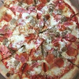 Pepperoni, sausage, ham, green peppers, mushrooms and onions.