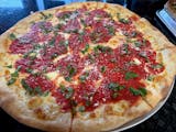 A flavor that takes you back to Naples extra thin crust made with sliced fresh mozzarella, san marzano tomato, comes with fresh basil upside pizza, cheese on the bottom and sauces on top.