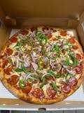 Cheese, sauce, pepperoni, sausage, green peppers, onions & mushrooms.