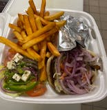 Crispi chicken, french fries, jalapeno poppers, mozzarella sticks, bacon & topped with ranch & hot sauce.