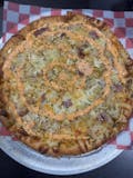 Homemade red sauce, pepperoni, sausage, bacon, and ham.