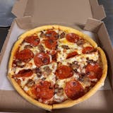 Pepperoni, sausage, bacon, mushrooms, onions, green peppers, hot or mild peppers, and black olives.