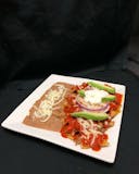 Fried tortilla with chicken, scrambled egg, red sauce, onion, cheese, and sour cream served with beans.