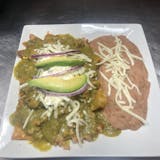 Fried tortilla with chicken, scrambled egg, green sauce, onion, cheese, and sour cream served with beans.
