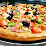 Pizza topped with mushrooms, onions, green peppers, tomatoes, black olives and garlic