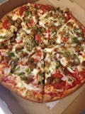 Italian sausage, salami, pepperoni and spicy ham smothered in 2 cheeses with our amazing homemade pizza sauce!