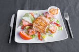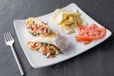 Grilled chicken breast wrapped in warm pita bread with lettuce, tomatoes, and bacon topped with ranch dressing. Comes with fries or chips with your choice of can soda.
