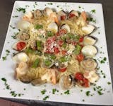 Shrimp & clams sauteed with cherry tomatoes in a white wine sauce, served over angel hair.