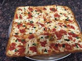 Square thin crust, roasted garlic, plum tomatoes, pesto & mozzarella.