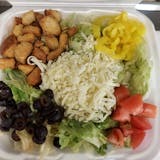 Lettuce, cheese, croutons, tomatoes, pepper rings and olives.