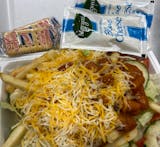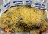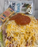 Crisp lettuce, taco meat, nacho, chips, tomatoes, cheddar cheese & taco sauce packs.