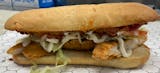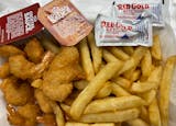 Breaded popcorn shrimp dipped in hot sauce, fries, crisp lettuce, tomatoes, cucumbers & cheddar cheese.