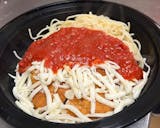 Pizza sauce, taco meat, nacho chips, cheddar cheese, lettuce, tomatoes & taco sauce packs.