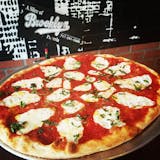 Tomato sauce base. Fresh mozzarella cheese topped with fresh basil