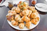 Our white, in a bed of mozzarella cheese, topped with fresh garlic, and herbs.