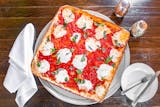 Thin crust square with chunky tomatoes, basil & fresh mozzarella cheese. Served with your choice of red or white sauce.