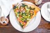 White pizza with fresh sauteed spinach, broccoli, tomatoes and mozzarella and ricotta cheese.