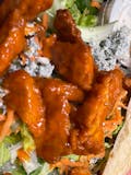 Chicken tenders tossed in mild sauce over romaine & field greens with carrots, celery, tomatoes, bleu cheese crumbles, and served with bleu cheese dressing.