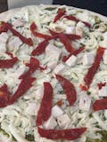 Marinated chicken, pesto, mozzarella cheese & sun-dried tomatoes, topped with romano cheese.