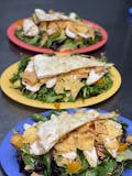 Grilled chicken, field greens, mandarin oranges, almonds, frizzled wontons, tossed with sesame seeds & oriental sesame ginger vinaigrette.