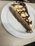 Rich, Creamy peanut butter pie topped with chocolate drizzle….