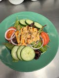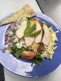 Barbecue chicken, romaine lettuce, grilled corn, avocado, cucumbers & tomatoes with barbecue ranch dressing topped with frizzled onions.