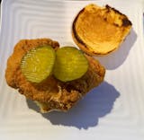 Golden-fried chicken breast, pickles, on toasted buttery potato roll.