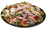 Grilled chicken with fresh greens, red onions, green peppers, black olives and tomatoes. Sprinkled with mozzarella, cheddar and Pecorino Romano cheeses.