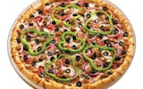 A customer favorite for 30 years! Traditional red pizza sauce, pepperoni, mushrooms, green peppers, red onions, black olives, Italian sausage and mozzarella cheese.