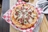 White garlic sauce, goat cheese, mozzarella cheese, caramelized onion, cherry tomato, parmesan cheese and balsamic glaze