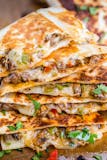 (Lamb or chicken) Red or white garlic sauce, mozzarella, feta, gyro meat pieces, onion, with a side of tzatziki.