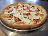 Traditional fresh mozzarella cheese on our pizza sauce with basil and olive oil.