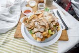 Your choice of beef or chicken. 100 % top round sirloin steak chicken steak 100 % chicken breast seasoned and prepared in house.