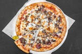 Steak, Fried Onions, Green Peppers, Pepperoni, Beef Bacon, Garlic Powder, Sauce, and Cheese.