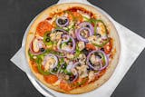 Pepperoni, sausage, green peppers, onions, olives & mushrooms.