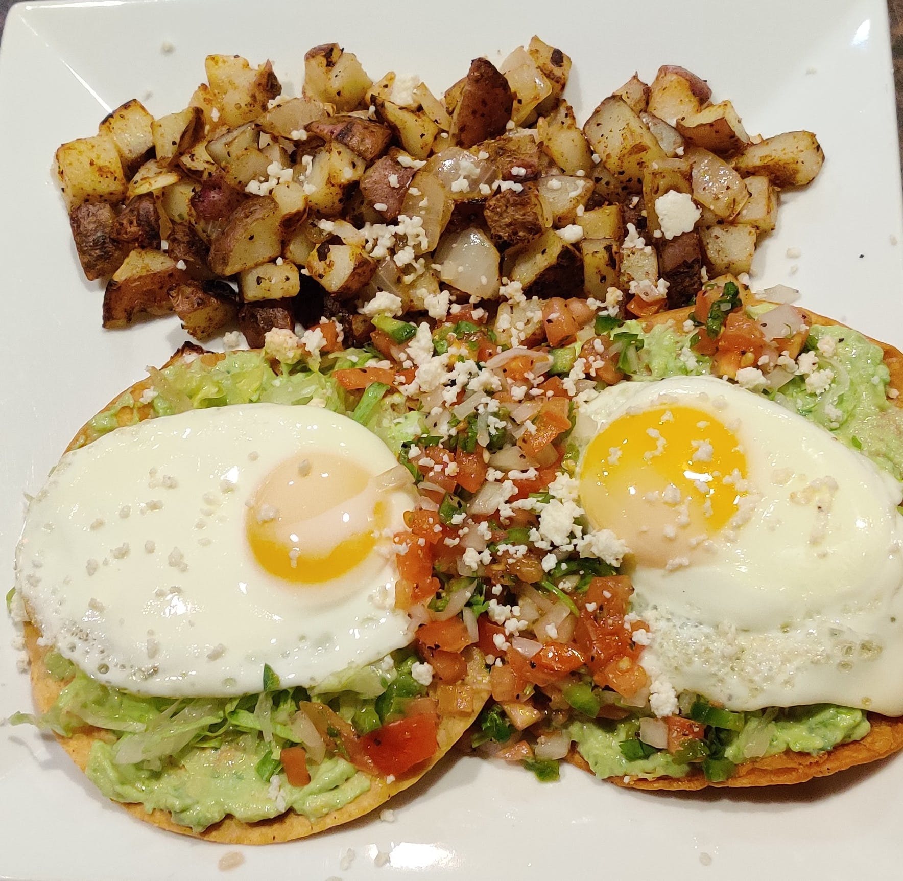 Two soft corn tortillas topped with refried beans, red salsa, fried egg and queso fresco. Served with home-fries or salad.