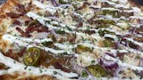 Crispy crust, roast beer-can chicken breast, pork belly bacon, mozzarella, caramelized onions, cowboy candy, Romano & our in-house RPG sauce (Ranch, Parmesan Garlic).....