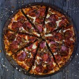 Pizza sauce, cheese, pepperoni, sausage, mushrooms, green peppers & onions.