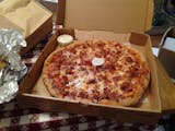 Pepperoni, sausage, bacon, mushrooms, tomatoes, green peppers, red onions, black olives, mozzarella & provolone cheese.