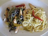 With fresh grilled chicken and green peppers, black olives in a garlic sauce with spaghetti.