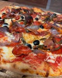 Tomato sauce, mozzarella, black olives, pepperoni, sweet peppers, onons, Italian sausage, mushrooms.