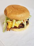 Bacon cheeseburger with tomatoes, lettuce & BBQ sauce.