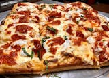 Pepperoni, bacon, sausage, onions, fresh peppers, black olives, mushrooms, meatballs.