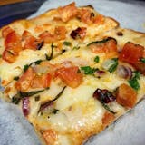 A mix of pizza sauce and Alfredo sauce base, bacon, cup and char pepperoni sliced cherry peppers, lots of mozzarella and topped with Mike’s hot honey.