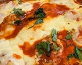 Thick crust white pizza with fresh garlic and olive oil, spinach, bacon, tomato parmesan cheese, mozzarella cheese & ricotta cheese.